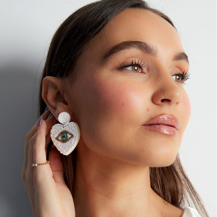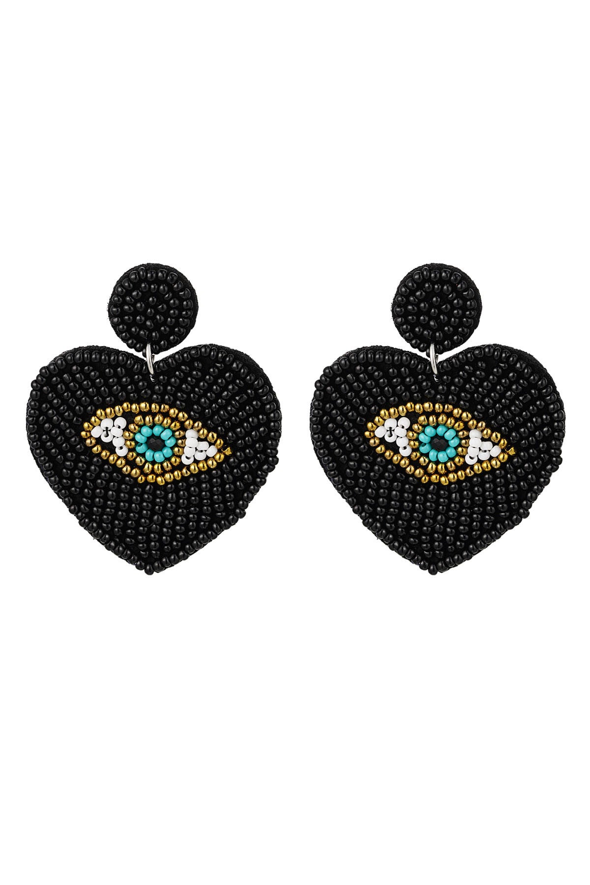 De kralenoorbellen met oog zijn gemaakt van glaskralen, stof en Stainless Steel en hebben een afmeting van 5 cm