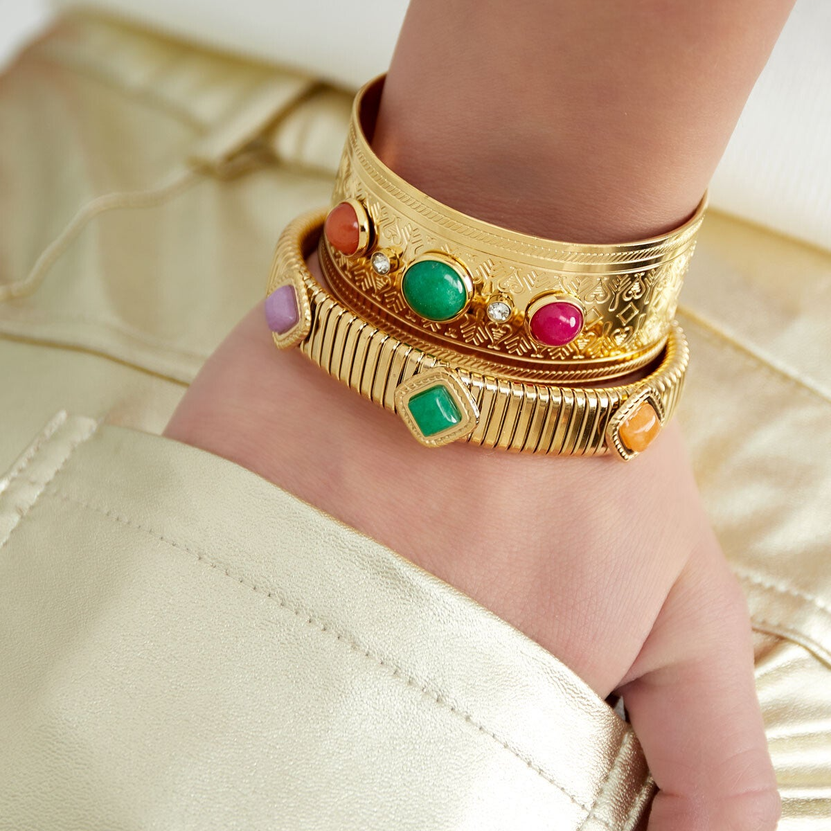 De armband is gemaakt van stainless steel en steen. De afmeting van de armband is 1.1 bij 4.9 centimeter