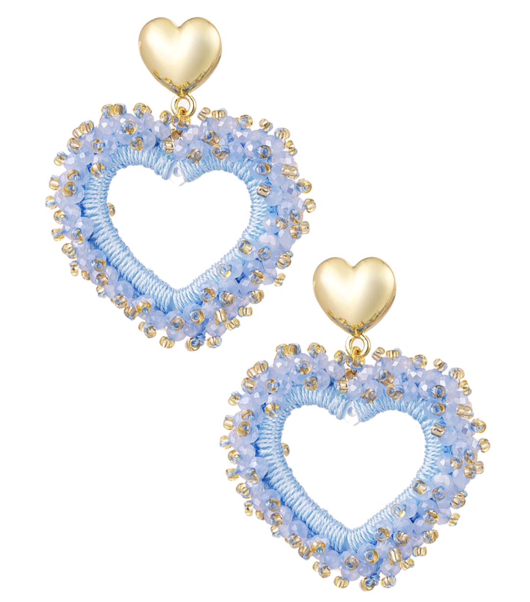 Deze opvallende oorbellen combineren een speels hartvormig design met een elegante uitstraling. De lichtblauwe kralen zijn zorgvuldig verwerkt rondom het hart en geven de oorbellen een verfijnde, handgemaakte look. De goudkleurige hartvormige stud zorgt voor een mooie balans tussen speels en chic.