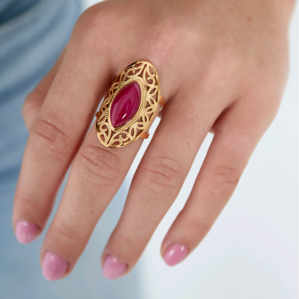 Deze verstelbare ring heeft een grote donkerrode steen.