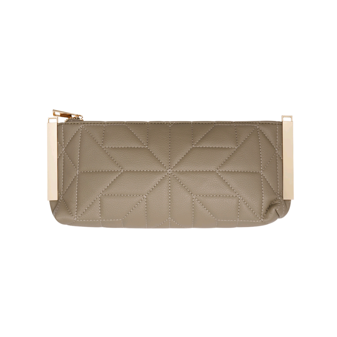 Deze elegante clutch in een zachte taupe kleur is een veelzijdige accessoire die perfect past bij elke outfit. Het geometrisch gewatteerde patroon geeft de tas een luxe en moderne uitstraling, terwijl de goudkleurige details zorgen voor een chique finishing touch.