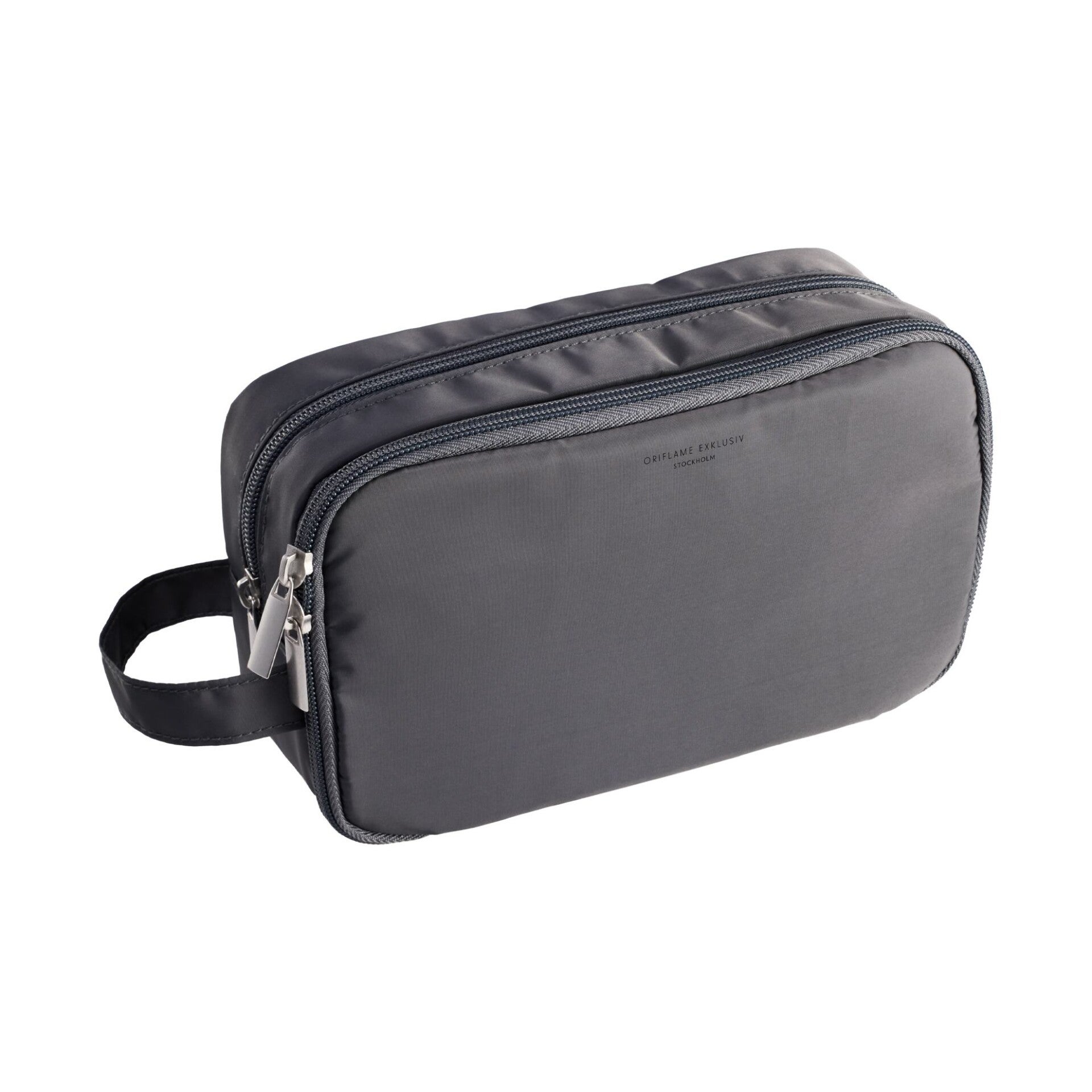 Slimme toilettas in een sportieve grijze kleur met een oranje voering en een praktische band, organiseervakken van meshstof en een ritsvak van meshstof.