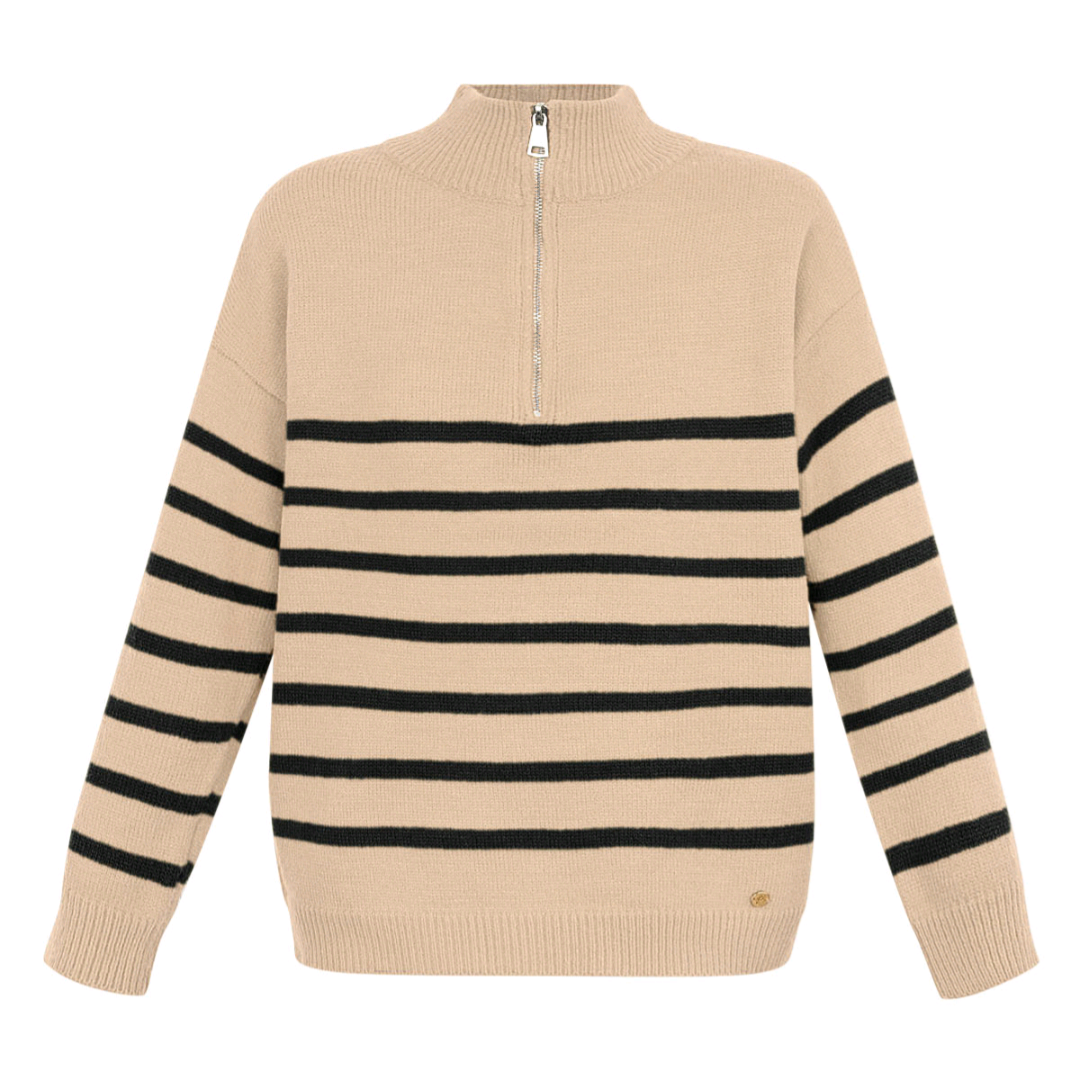 Deze stijlvolle gebreide sweater met halve rits combineert comfort met een moderne uitstraling. De beige basis met zwarte strepen geeft het item een rustige maar karaktervolle look. De opstaande kraag en ribafwerking zorgen voor een nette afwerking, terwijl de zachte knit prettig draagt. Perfect voor zowel casual als smart-casual outfits.